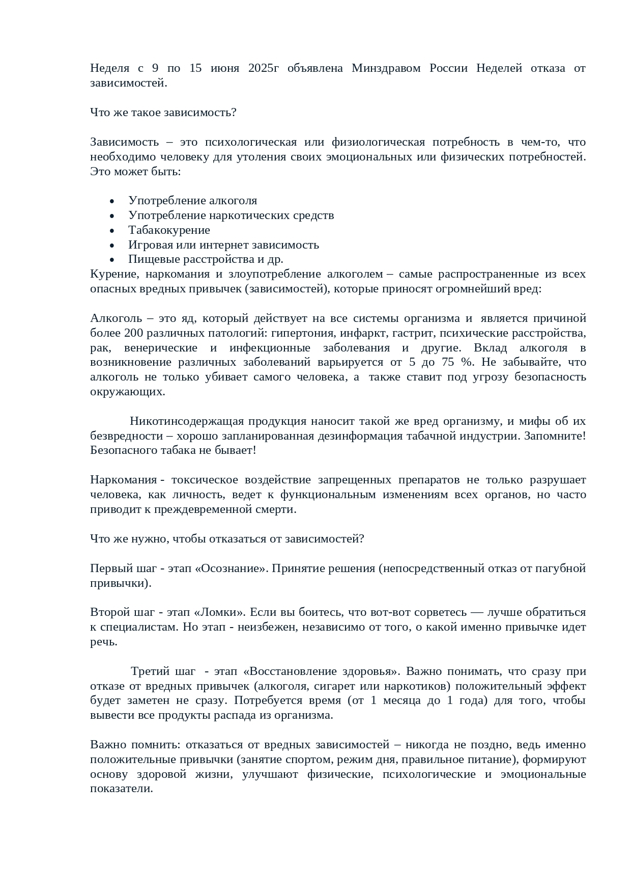 С 9 по 15 июня 2025г проходит Неделя отказа от зависимостей